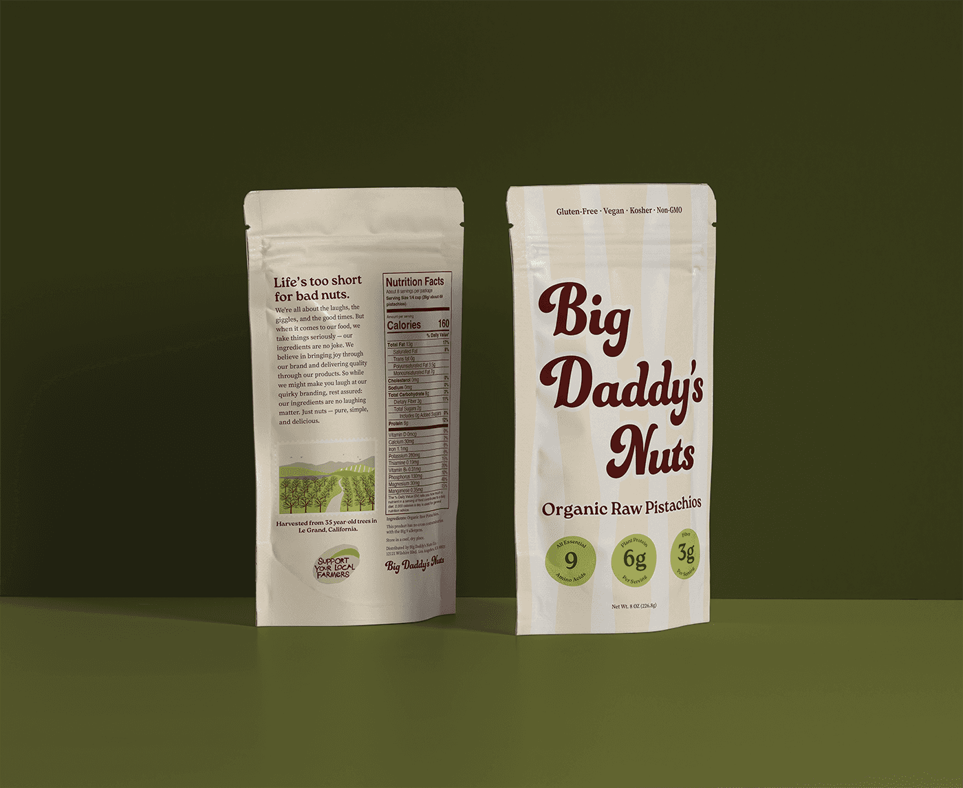 Big Daddy’s Nuts isn’t your average snack brand—and that’s exactly how we like it. With a name that turns heads, we set out to built a brand that’s cheeky, playful, and impossible to ignore. We created the full brand identity, including a custom pistachio mascot and packaging that brings the brand to life. But behind the humor is a product that takes itself seriously: raw, health-conscious pistachios with zero junk and a whole lot of intention. From the packaging to the personality, everything was designed to strike the perfect balance between silly and smart—because clean snacks can still have a dirty sense of humor.